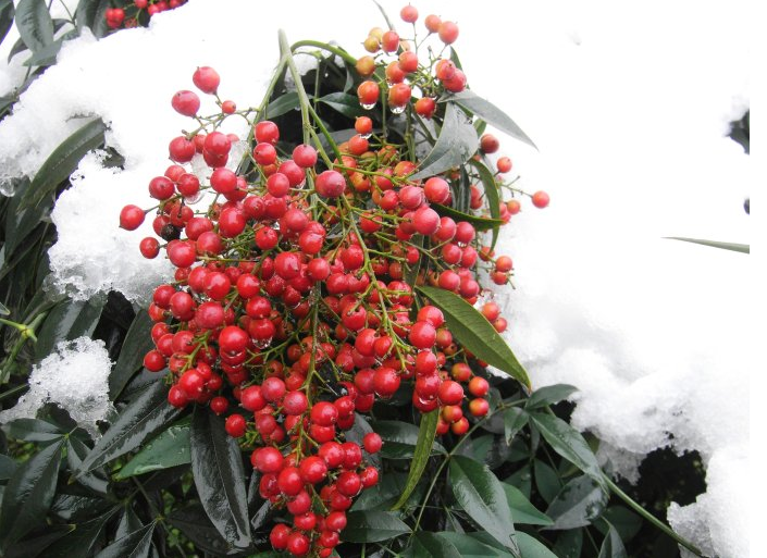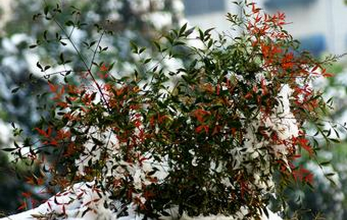 南天竺株高約2m,常綠叢生灌木,全株無毛。直立,少分枝。老莖淺褐色,幼枝紅色。葉對生,2-3回奇婁羽狀復葉,小葉南天竹橢圓狀披針形,長3-10cm。圓錐花序頂生;花小,白色;漿果球形,鮮紅色,偶有黃色,直徑0.6-0.7cm,含種子2粒,種子扁圓形。宿存至翌年2月。莖直立,少分枝,幼枝常為紅色。葉互生,常集于葉鞘;小葉3-5片。它的花期5-6月;