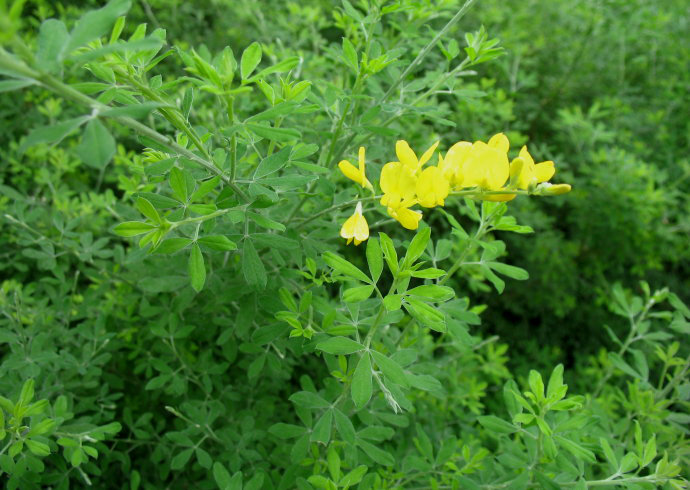 灌木,高80-250厘米。枝叢生,直立,分枝細長,無毛,具縱,長的細棱。上部常為單葉,下部為掌狀三出復葉;具短柄;托葉小,通常不明顯或無;小葉倒卵形至橢圓形全緣,長5-15毫米,寬3-5毫米,莖上部的單葉更小,先端鈍圓,基部漸狹至短柄,上面無毛或近無毛,下面稀被貼伏短柔毛。花單生上部葉夜,于枝梢排成總狀花序,基部有呈苞片狀葉;花梗細,長約1厘米;無小苞片;萼二唇形,無毛,通常粉白色,長約4毫米,萼甚細短,上唇3短尖,下唇3短尖;花冠鮮黃色,無毛,長1.5-2.5厘米,旗瓣卵形至圓形,先端微凹,翼瓣與旗瓣等長,鈍頭,龍骨瓣闊,彎頭;雄蕊單體,花藥二型;花柱細,伸出花冠并向內旋曲,長達2厘米。莢果扁平,闊線形,長4-5厘米,寬1厘米,縫線上被長柔毛;有多數種子。種子橢圓形,長3毫米,灰黃色。花期5-7月。